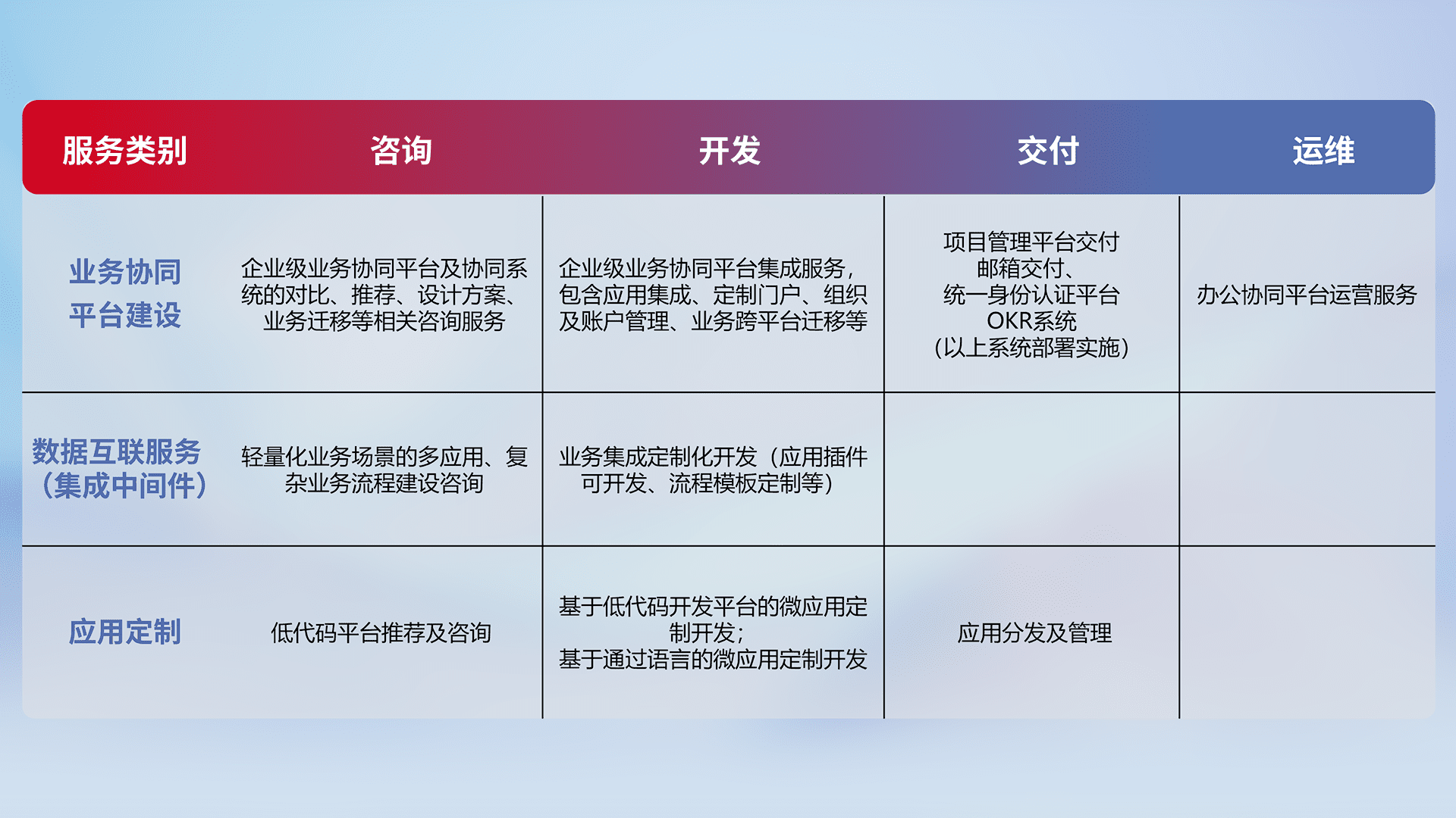 针对钉钉、、企微、、、IDaas等平台级产品提供产品的规划、、、方案、、、、交付、、、、定制化开发等服务,,,,实现如统一协同办公、、智能客户服务、、、混合会议管理、、智能数据查询、、等业务场景,,,实现数字化转型。。